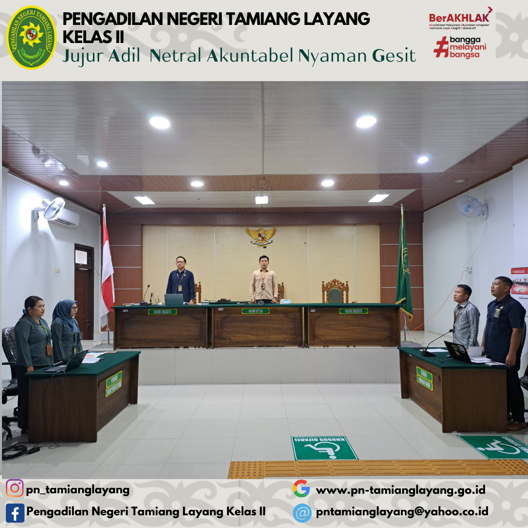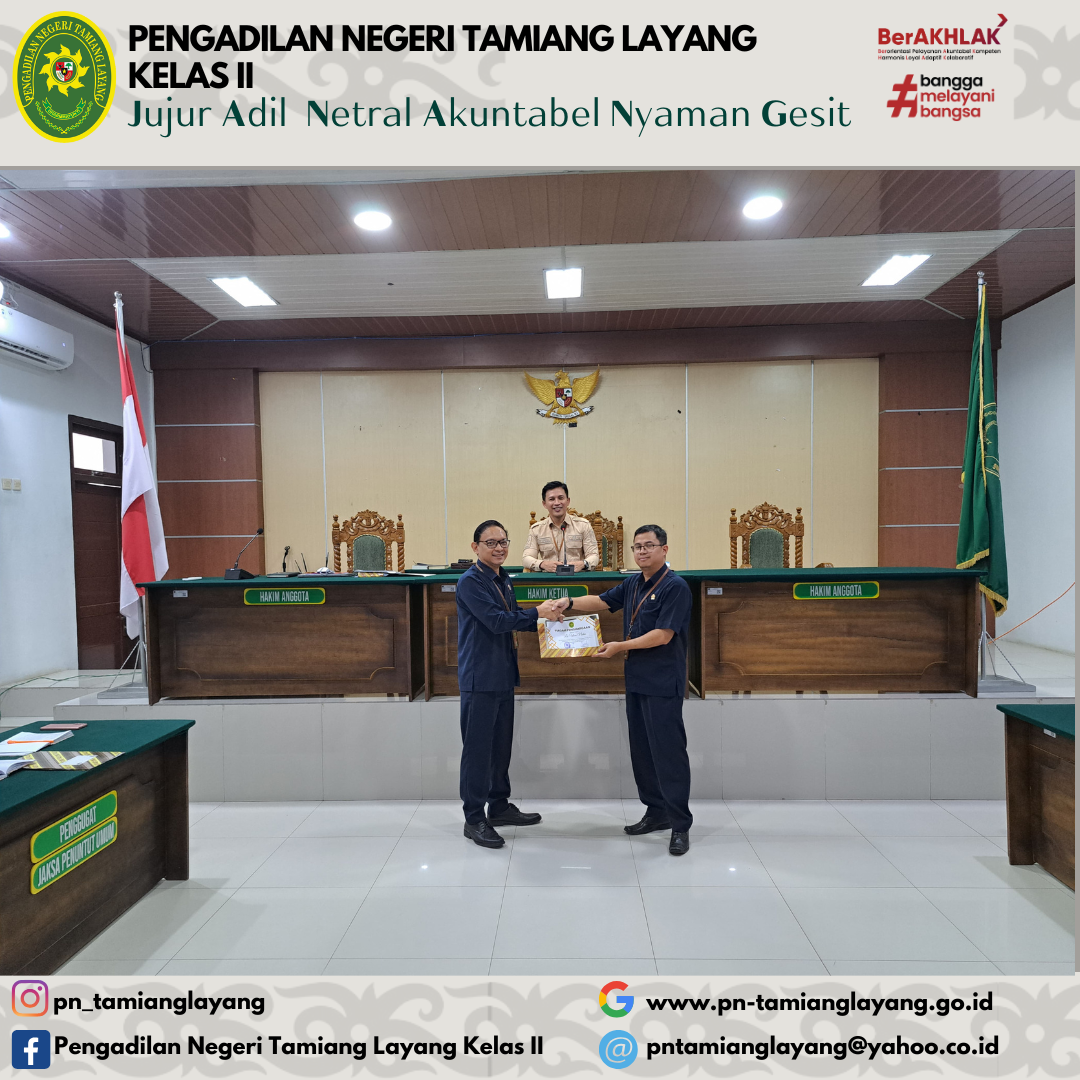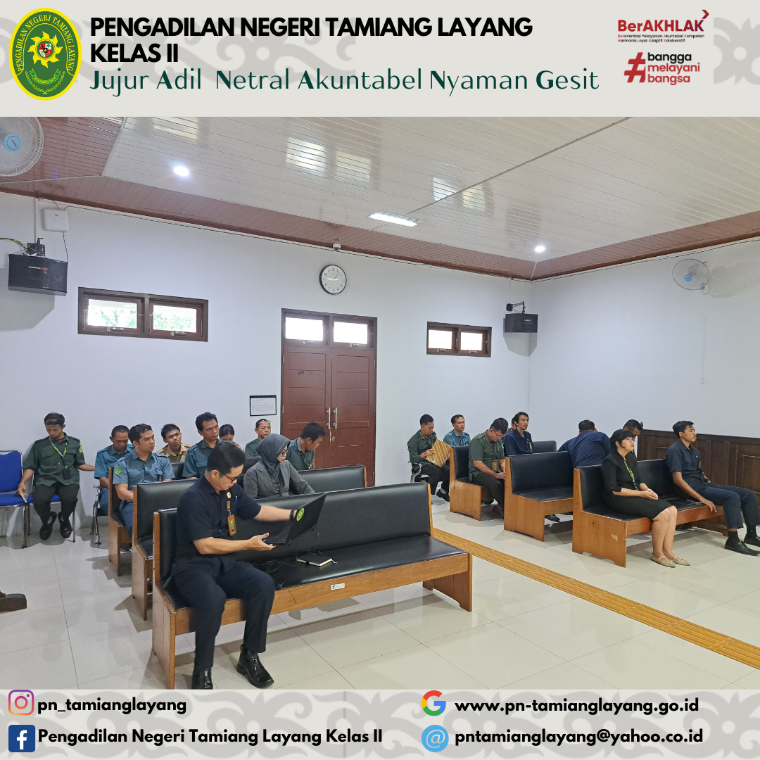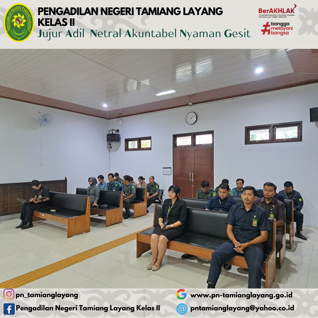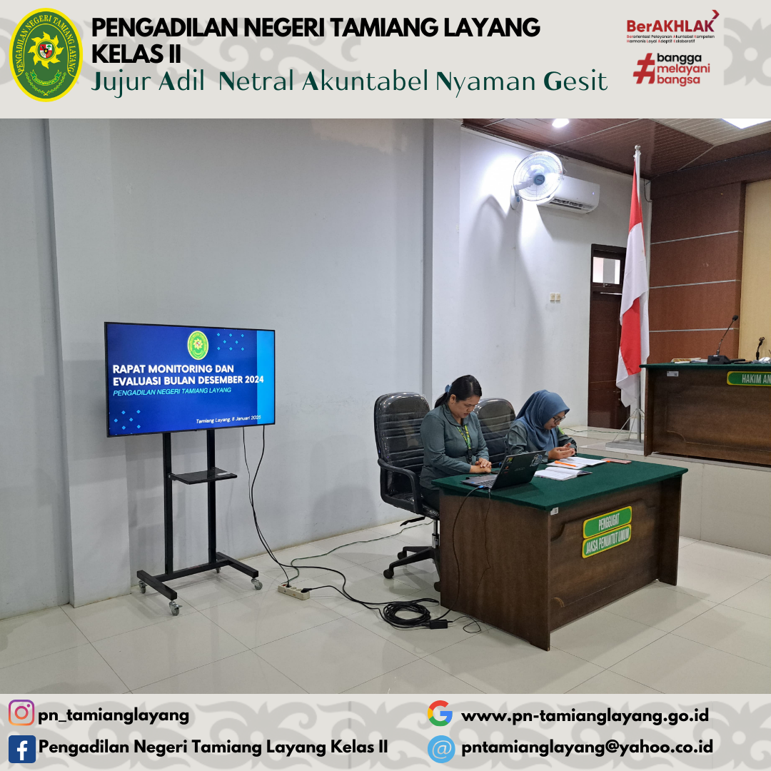 Pada Ruang Sidang Cakra Pengadilan Negeri Tamiang Layang telah dilaksanakan Rapat Monitoring dan Evaluasi Bulan Desember 2024 yang dipimpin oleh Ketua Pengadilan Negeri Tamiang Layang Bapak Moch. Isa Nazarudin, S.H., M.H. Rapat dimulai dengan menyanyikan lagu Indonesia Raya dan Hymne Mahkamah Agung kemudian dilanjutkan dengan Doa. Proses penyampaian Tindak Lanjut Hasil Evaluasi bulan November oleh Ibu Mahdalina dilanjutkan dengan penyampaian hasil Evaluasi Kinerja Kepaniteraan yang disampaikan oleh Panitera Pengadilan Negeri Tamiang Layang Bapak Surya Harry Prayoga, S.H., M.H. dan penyampaian hasil Evaluasi Kinerja Kesekretariatan yang disampaikan oleh Bapak Citra Adi Asmara, S.E. selaku Sekretaris Pegadilan Negeri Tamiang Layang. Acara Kemudian dilanjutkan dengan penyampaian hasil pengawasan bidang serta Evaluasi Penilaian EIS bulan November oleh Wakil Ketua Pengadilan Negeri Tamiang Layang Bapak Muhamad Iqbal, S.H. dan dilanjutkan dengan pembinaan oleh Ketua Pengadilan Negeri Tamiang Layang Bapak Moch. Isa Nazarudin, S.H., M.H. sekaligus menanggapi hasil evaluasi yang telah disampaikan oleh Wakil Ketua, Panitera dan Sekretaris Pengadilan Negeri Tamiang Layang. Rapat di tutup dengan mengumandangkan yel-yel serta menyanyikan lagu Bagimu Negeri dan Penyerahan Sertifikat Pegawai Serta PPNPN terbaik Bulan Desember 2024.