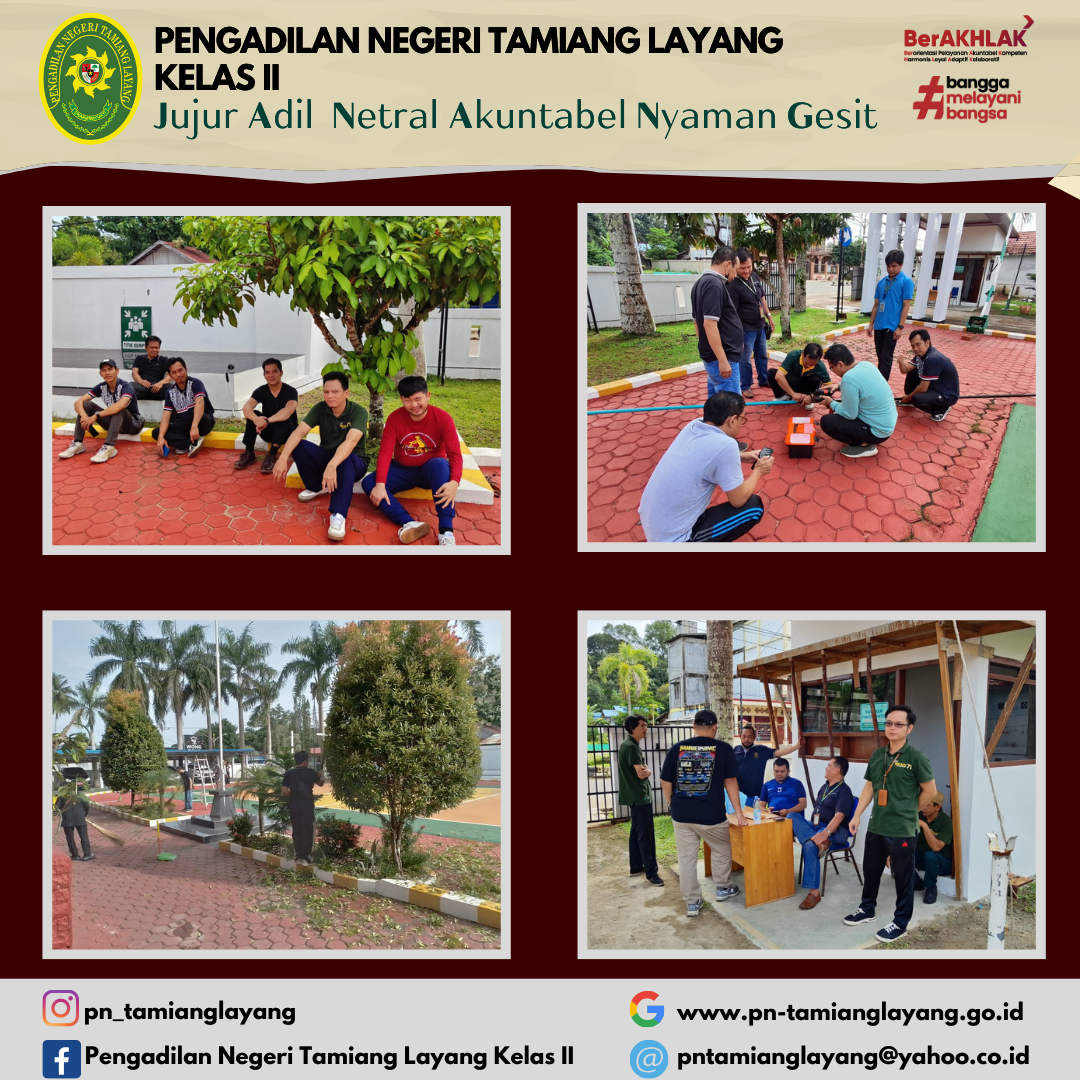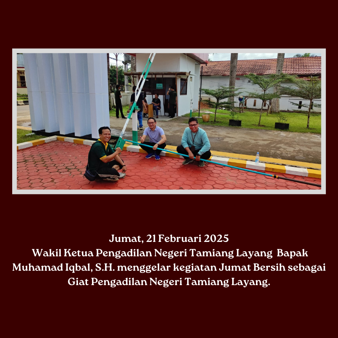 Wakil Ketua Pengadilan Negeri Tamiang Layang Bapak Muhamad Iqbal, S.H. menggelar kegiatan Jumat Bersih yang juga diikuti oleh seluruh jajaran sebagai upaya membersihkan seluruh halaman dan taman pada Pengadilan Negeri Tamiang Layang.